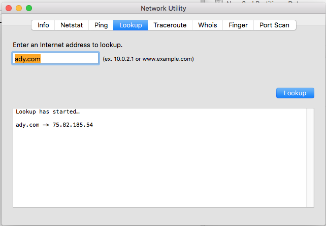 3. On a Mac, go to an app called "Networl Utility" and lookup the site. It will give you the IP that the internet has for the domain. In this case 75.82.185.54